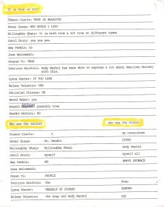 Participants artists Willoughby Sharp, Helen Valentin, Bernd Naber, Franco Ciarlo, Donald Sheridan, Peter Grass, Lynne Kanter, Souyun Yi, Carol Drury, Amy Paskin, Christian Chiansa, Patrizia Anichini, and myseld, ate a Campbell soup. Only Joan Waltmath refused to eat it.