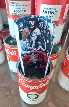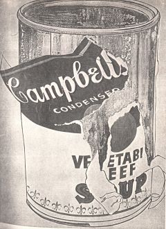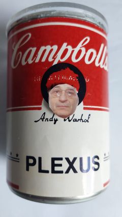 It looks like an Andy Warhol's Campbell soup can, if it is exposed to a beholder of the artworld. Its label is red and white. The "e" of Campbell is changed to an "o" in Campboll's, It has a central circle with the words "Dematerialized Andy Warhol" and Andy Warhol's face which hold the center of attention. On its bottom the word PLEXUS.