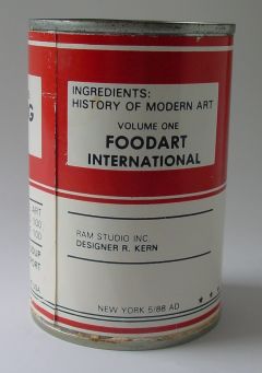 It has a cylindrical form, balanced symmetrical design, a spatial organization with 2 red and white rectangular units, with written messages: "Directions: Eating Art", "Ingredients: History of Modem Art. Volume One: FoodArt International".