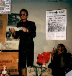 It was only one hour spectacular event for the public, built for a week through an atelier des arts, performed by a cast of musicians, poets, actors, dancers, videomakers, performers and visual artists, featuring many prominent figures on the N.Y. downtown avant-garde scene, on board a metaphoric art slaves boat.