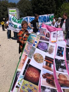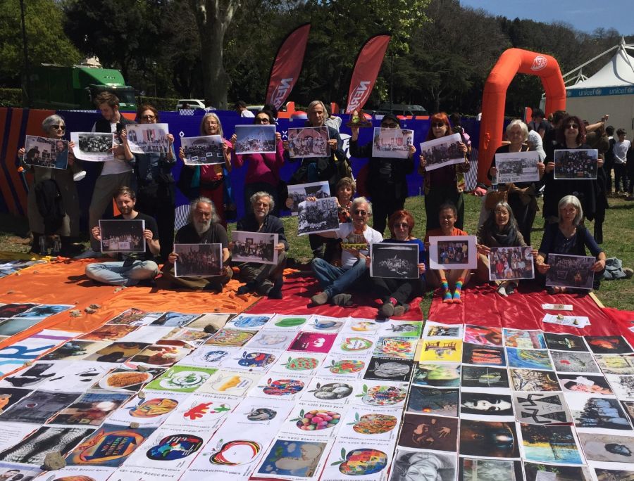 1. La Bandiera dell’Arte per la Pace di 75 mq, composta da 12 strisce di tessuto con i sei colori dell'arcobaleno, lunghe 7 m e larghe 1,50 m, con 708 fotocopie storiche originali inviate dal 2005 al 2019.